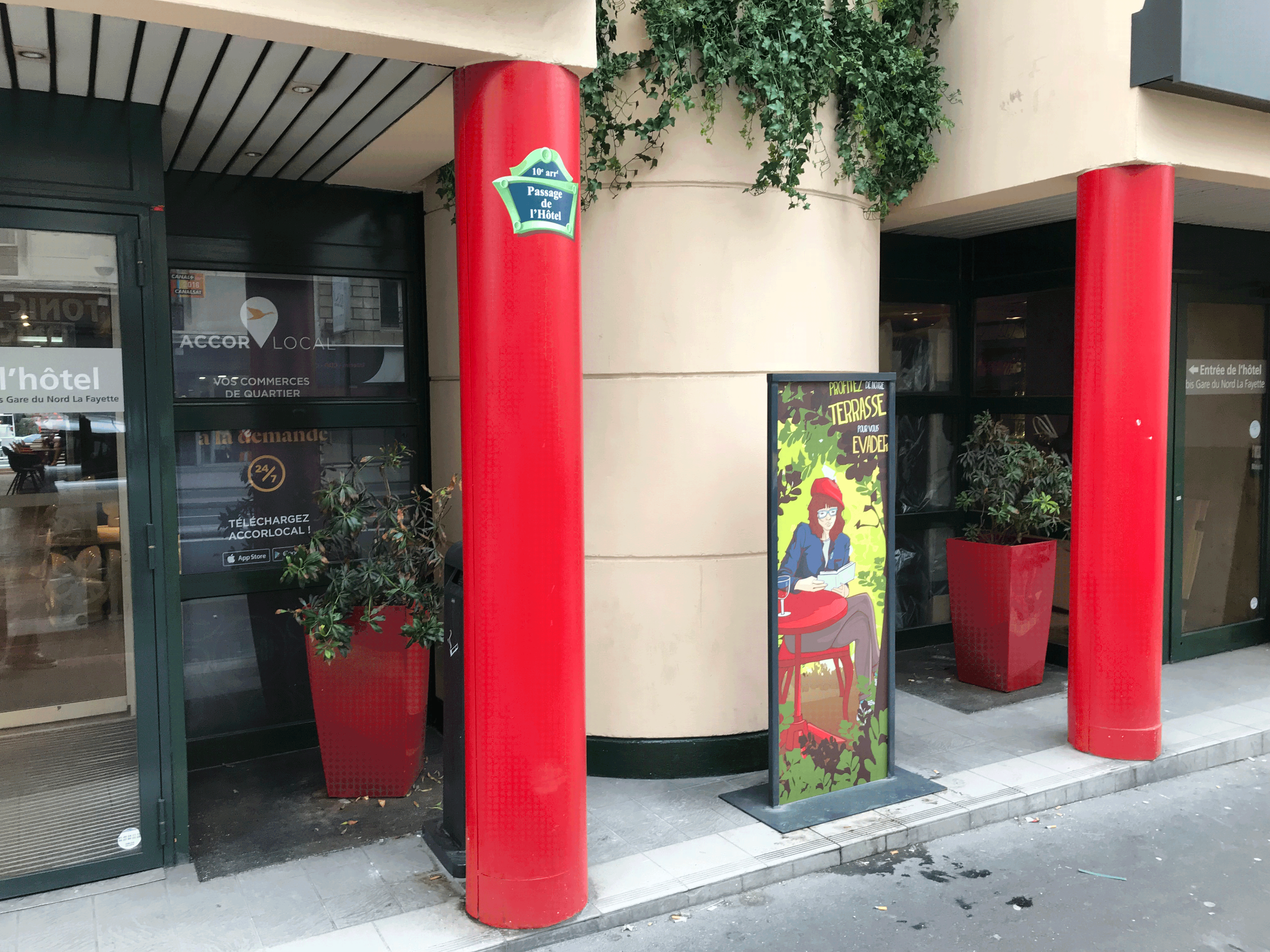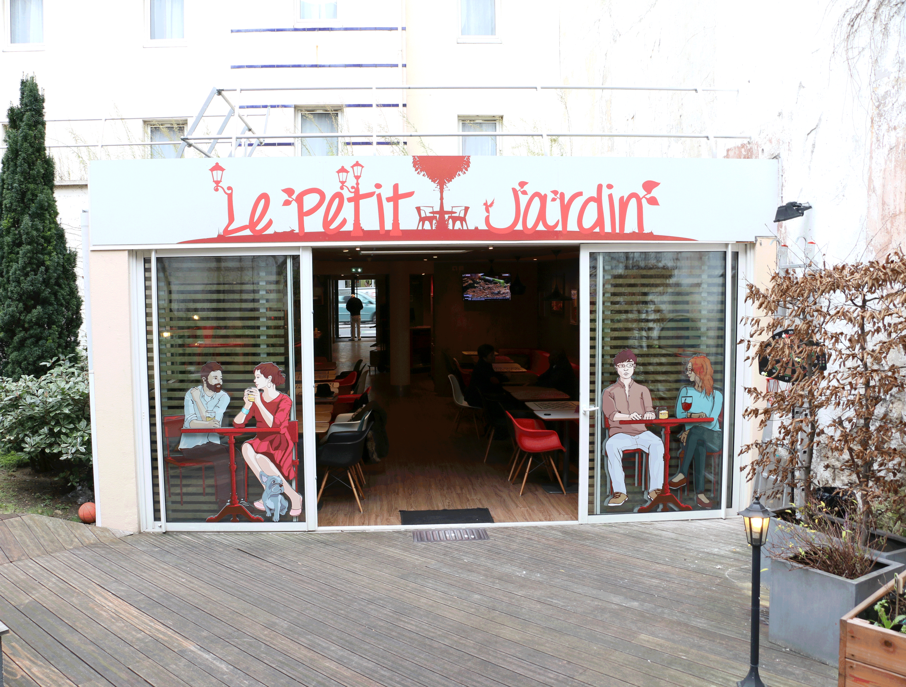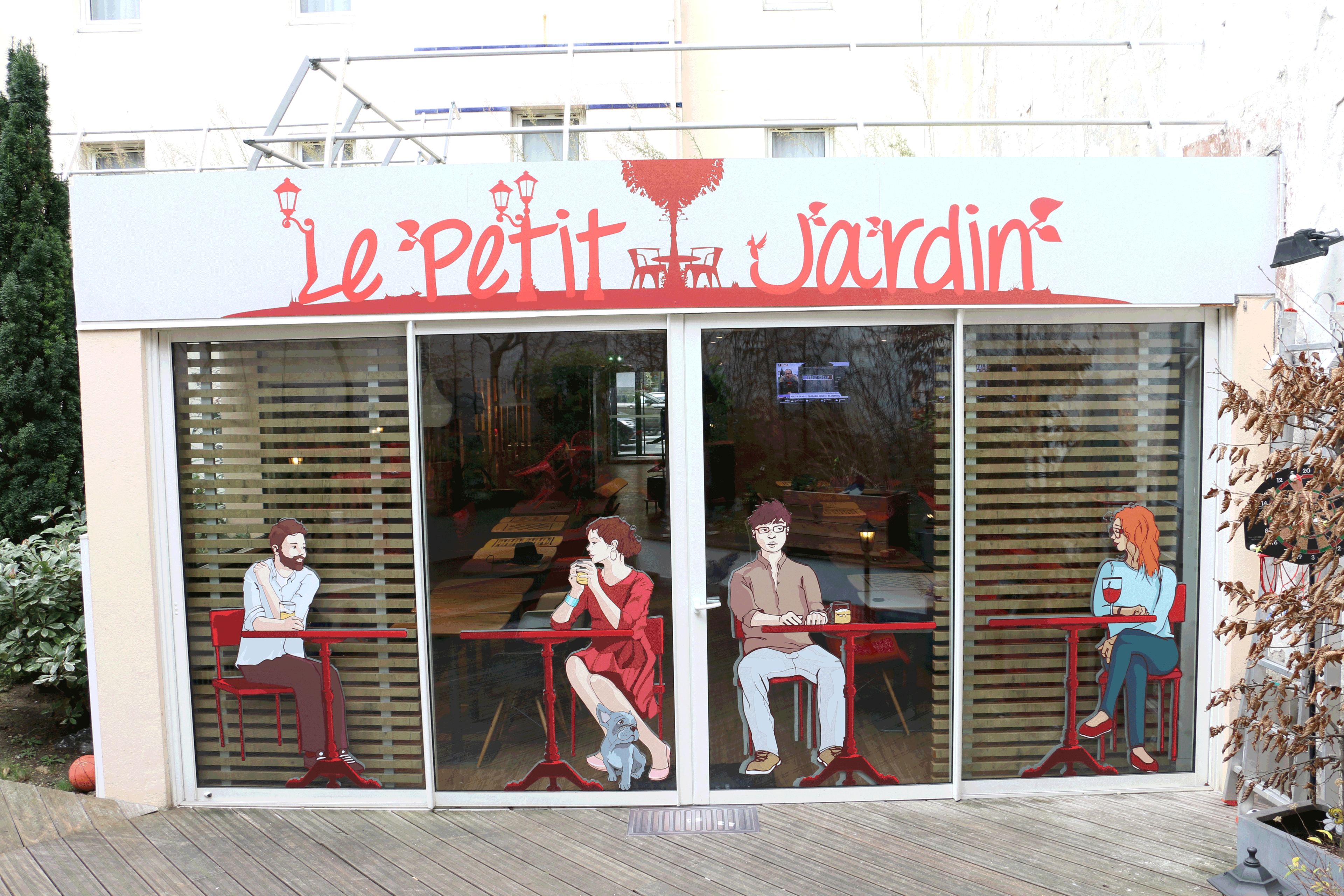 L'hôtel Ibis, rue Lafayette à Paris, nous a contacté pour habiller graphiquement leur jardin. Nous avons réalisé une version dessinée des éléments de décorations, intégrés dans un décor réel.